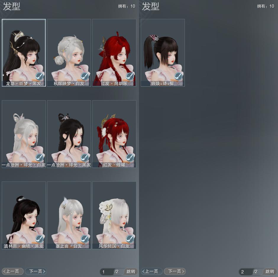 【发型】金发0个[], 红发2个[十四红, 兔红], 黑发3个, 白发4个, 盒子发型[三代福袋白发, 黑傣族黑发, 粉沧洲盒黑发, 粉沧洲盒白发, 白龙隐黑发, 六代重阳白发], 总页数2