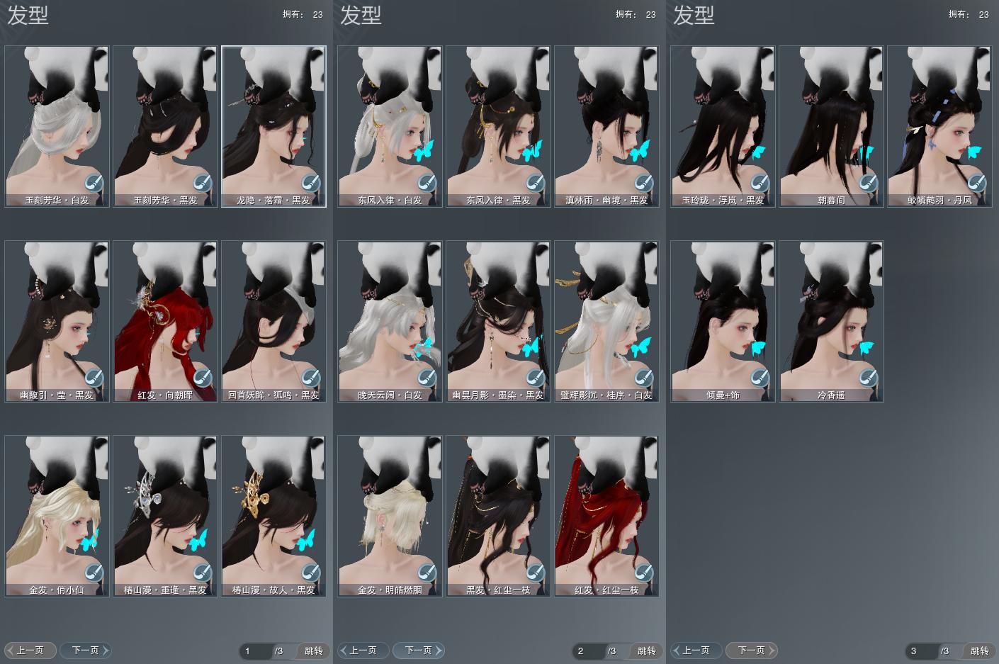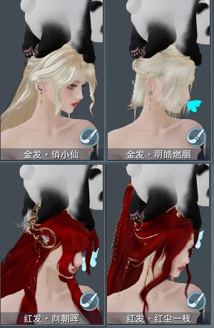【发型】金发2个[双十二金发, 金发俏小仙], 红发2个[十二红, 十四红], 黑发14个, 白发4个, 盒子发型[浮岚黑发, 十二黑, 黑幽昙黑发, 七中黄盒白发, 黑傣族黑发, 除夕盒黑发, 黑椿山黑发, 蓝椿山黑发, 除夕盒白发, 四代福袋白发, 红白妖眸盒黑发, 白幽馥黑发, 蓝龙隐黑发], 总页数3