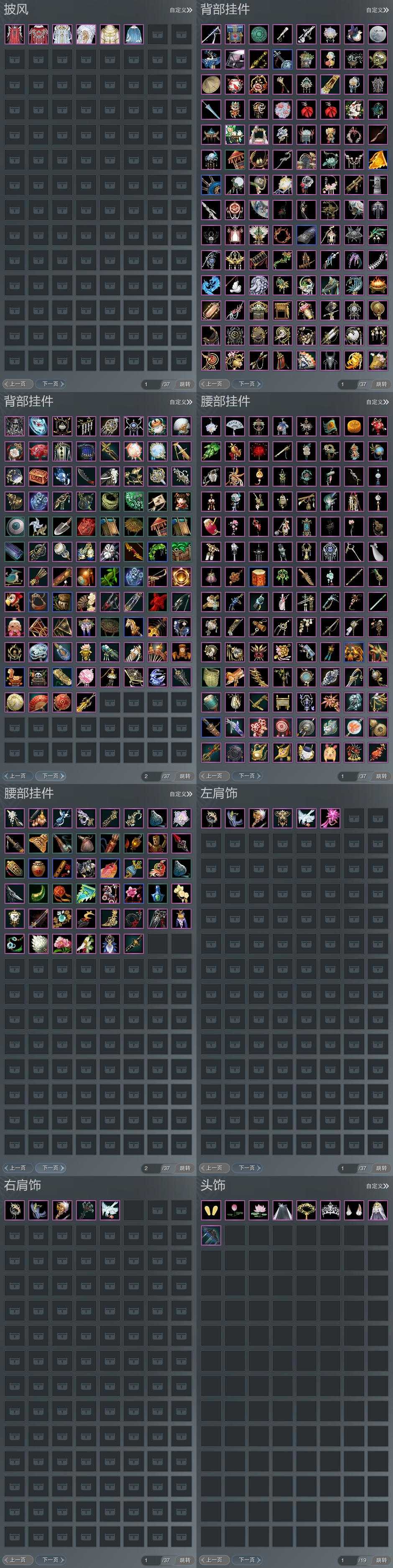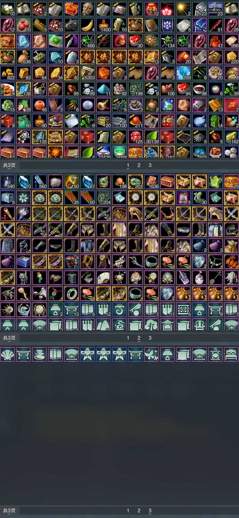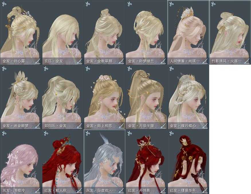 【发型】金发11个[狐金, 鸡金, 考金, 如归金, 牛金, 女仆金, 四代中秋金, 铃金, 玄江金发, 竹影火莲金发, 紫人间金发], 红发5个[蝶粉, 猴红, 虎红, 十五红, 三代灰银], 黑发37个, 白发23个, 盒子发型[晴岚绘黑发, 白楼兰黑发, 蓝腿白, 黄重阳黑发, 晴岚绘白发, 白楼兰白发, 墨心黑发, 烨然黑发, 黄重阳白发, 墨心白发, 沧海黑发, 白红尘黑发, 白游园黑发, 沧海白发, 唐风韶颜白发, 白红尘白发, 竹笛黑发, 鉴松影隅中黑发, 十二黑, 六代中秋黑发, 白海岛黑发, 竹影火莲黑发, 蓝水袖黑发, 红懒猪黑发, 花滑黑发, 紫人间黑发, 花滑白发, 七七黑发, 七中白盒黑发, 七七白发, 七中白盒白发, 白幽昙黑发, 幽涧愀兮白发, 除夕盒黑发, 黑椿山黑发, 除夕盒白发, 圆舞盒黑发, 黑沧洲盒黑发, 黑沧洲盒白发, 黑幽馥黑发, 婚纱盒黑发, 婚纱盒白发, 九七黑发, 青蛇盒黑发, 柿盒黑发, 黑上火黑发, 九七白发, 青蛇盒白发, 蓝沙丘白发, 瑶台仙梦黑发, 瑶台仙梦白发], 总页数9